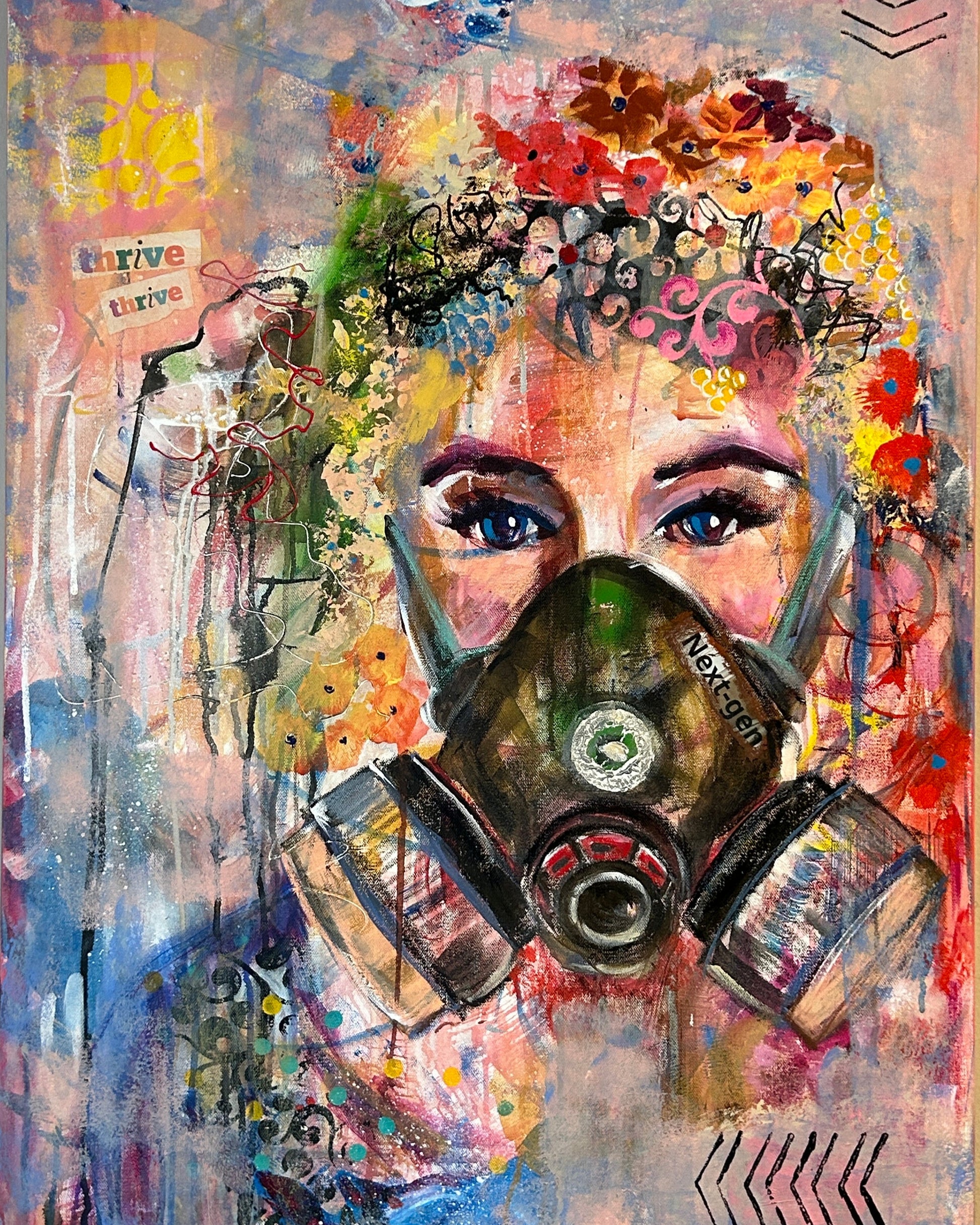 The central figure, a bold teenage girl, wears a mask—symbolizing her role in the fight against violence and for the freedom to speak her truth. Her vibrant hair, bursting with spring flowers, represents the renewal and growth of a generation that is both the future and the present. She is spring itself—full of life, hope, and transformation.